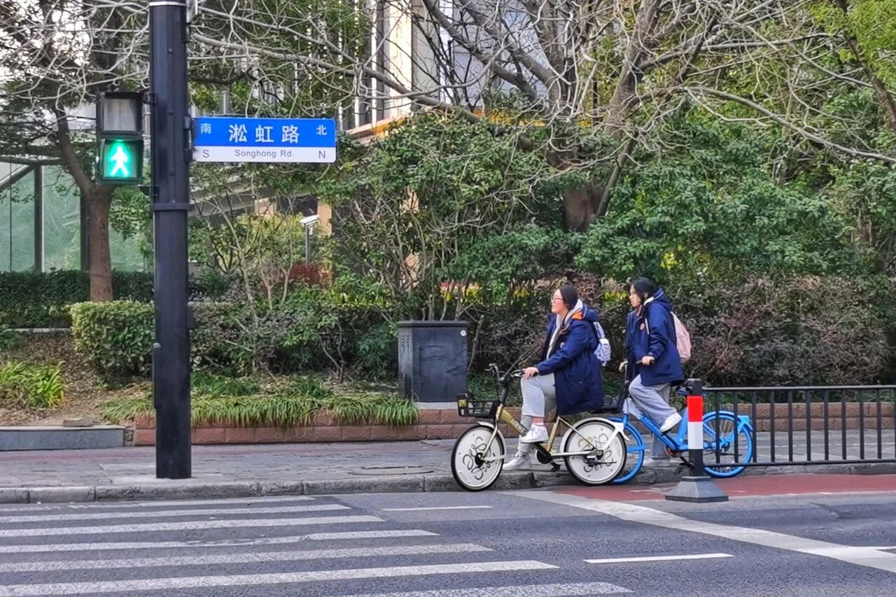在淞虹路附近,记者看到已有市民骑着哈啰与LOEWE罗意威联名的金色单车出行,其金色的车身和白底金字的简约车轮广告尤为亮眼。