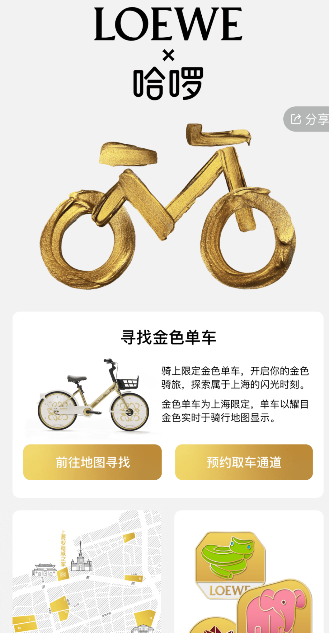 据悉,哈啰与LOEWE罗意威合作推出的这款限定款金色单车设计灵感源于上海罗意威之家闪耀的金色外立面,兼具艺术性与功能性,实现了出行工具从实用品到城市美学参与者的跨界探索,也让共享单车成为了传递城市生活文化的独特公共载体。