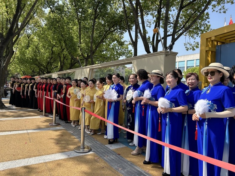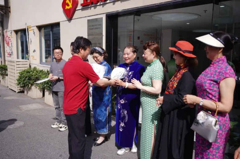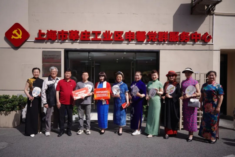 上午9点,随着“议述家”艺术团乐队欢快的旋律,百名身着不同颜色款式和风格的旗袍的女性从园区各处赶来,“钱笑呆艺术研究会”徐雄会长携画家们一起前来助阵,现场给旗袍方阵的队长们赠送手绘团扇,“申馨·创客空间”绘画党课也同步正式启动。徐会长表示,我们都是园区建设的志愿者,非常高兴能够在申馨党群服务中心这个平台,培育扶持项目主理人。我们将通过传统绘画技艺的创新,与时代发展相结合,将工业元素、非遗元素巧妙地融合,打造独具魅力的“工业区文化符号”。