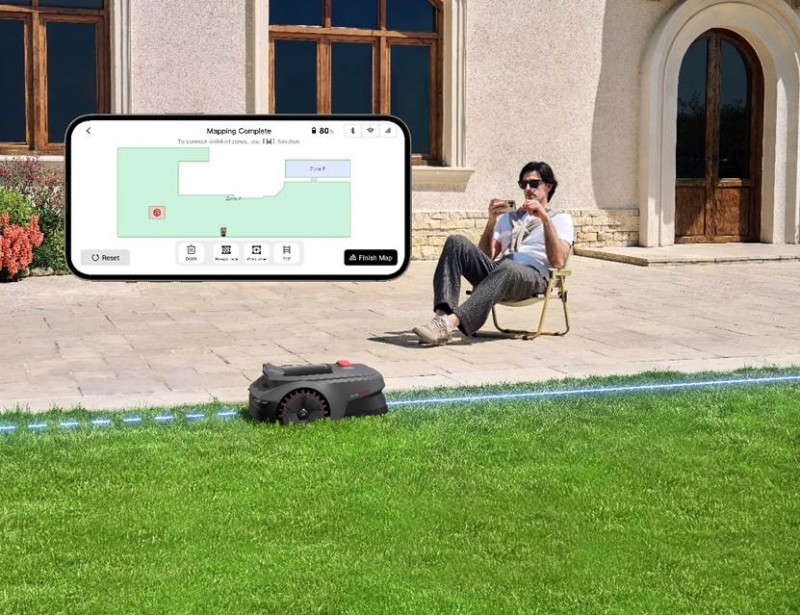与此同时,用户彻底告别了传统割草机的布线与RTK基站、信号杆配置,只需通过MOVAhome App简单几步,即可在手机上设定虚拟边界、禁入区以及通行路径。一分钟完成部署,首次花园建图仅需五分钟,真正实现零门槛智能化。