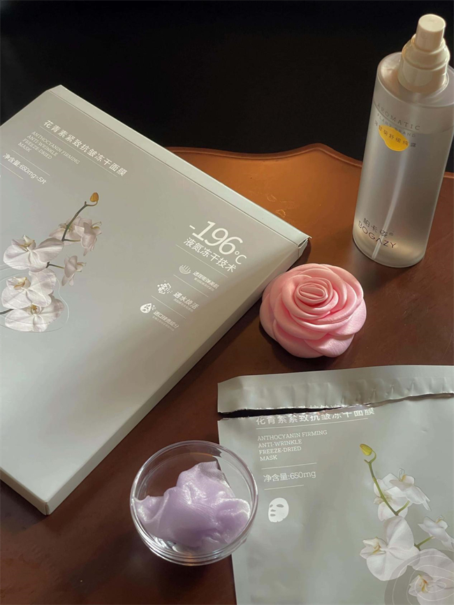 若说冻干精华是“时光胶囊”,那么花青素面膜便是“花的馈赠”。-196℃液氮冻干技术将高浓度精华封存于膜布,遇水即释。B-freezing凝时固态闪释专利技术(ZL:ZL202022059766.0)让精华快速渗入肌理,贴合时如又一层肌肤。花青素、山茶花与银耳协同防氧化,去除自由基,守护胶原;肌肽则减淡黯沉,焕亮肤色。而内外源双防线的设计:虾脊兰与玻色因从内部帮助胶原合成,紧实轮廓;乙酰基六肽-8与棕榈酰三肽则从外部抚平纹路,让肌肤逐渐舒展、嘭弹。当那片浸透玫瑰纯露的膜布轻轻覆上脸庞,似一朵沉眠于晨露中的玫瑰,此刻正被温柔唤醒。每一次贴合,都是肌肤被丰沛养分温柔包裹的沉溺时刻。