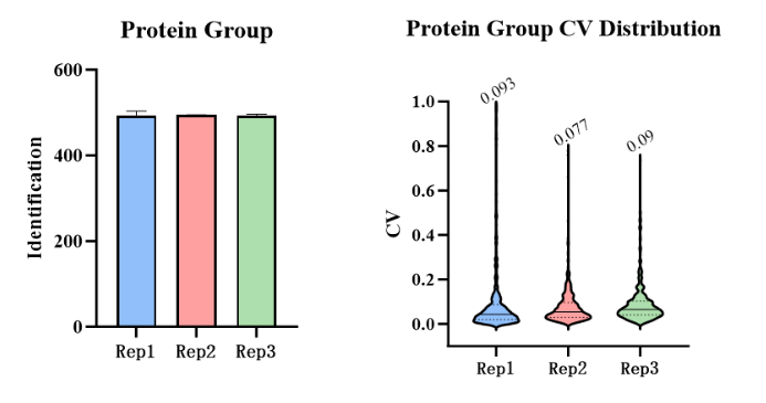 蛋白鉴定数目稳定:在三天独立实验中,蛋白鉴定数目稳定在500个左右。