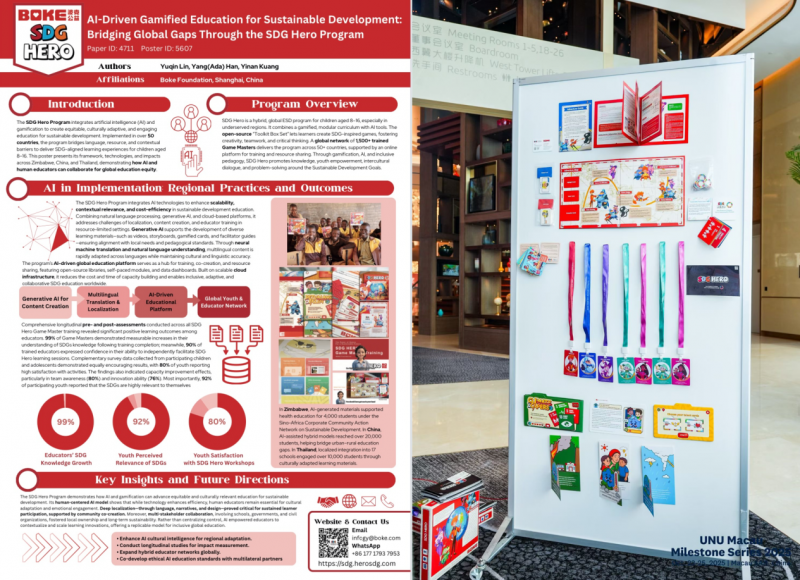 大会期间,联合国大学与斯普林格出版社联合出版的学术丛书 《Artificial Intelligence and Sustainable Development》(《人工智能与可持续发展》) 正式发布。上海波克公益基金会以 “AI + Education for Sustainable Development”(人工智能赋能可持续发展教育) 为主题,向该丛书递交了 SDG Hero 项目的学术案例论文。论文阐述了该项目如何将人工智能与游戏化学习相结合,在全球范围内促进教育公平、跨文化学习与可持续发展素养的提升,展现了AI在教育创新与社会影响力建设中的实践价值。