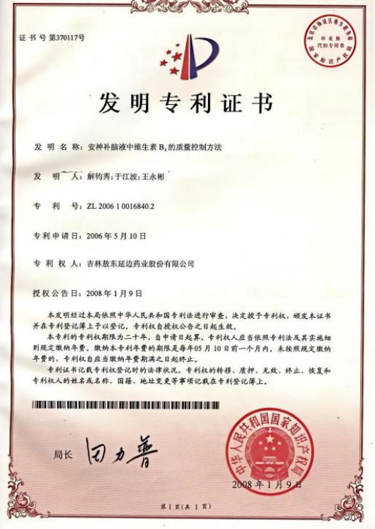(《安神补脑液中维生素B1的质量控制方法》,专利号 ZL200610016840.2)