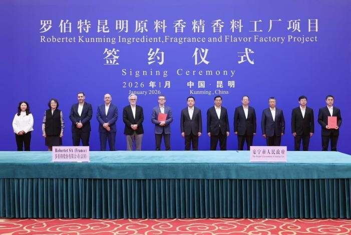2026年1月27日,柏联集团董事长刘湘云女士的三年牵线,让百年香料巨头罗伯特集团签约落地昆明,其原料香精香料工厂项目正式在国内启动。项目建成后,将进一步提升昆明在天然香精香料领域的产业竞争力。